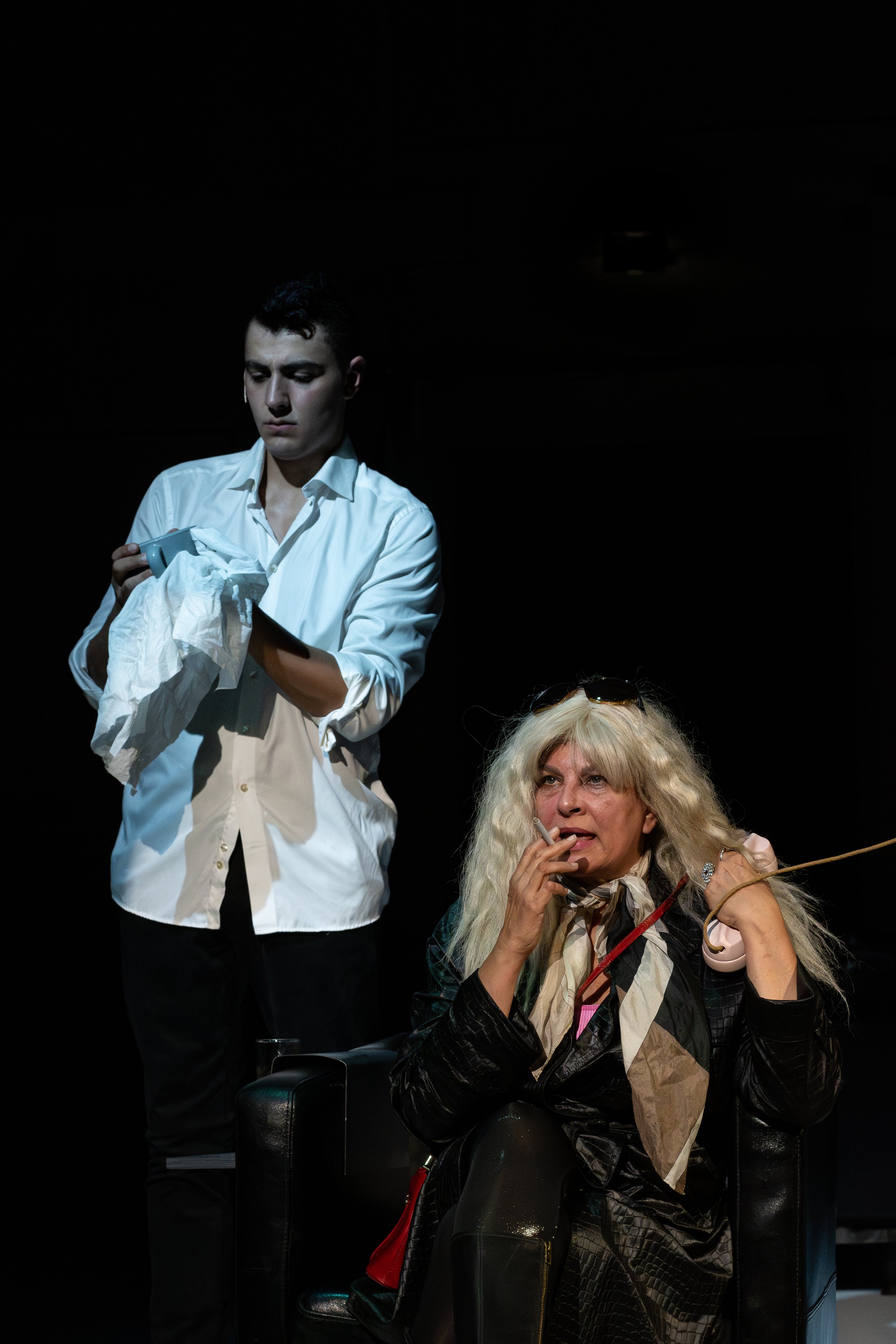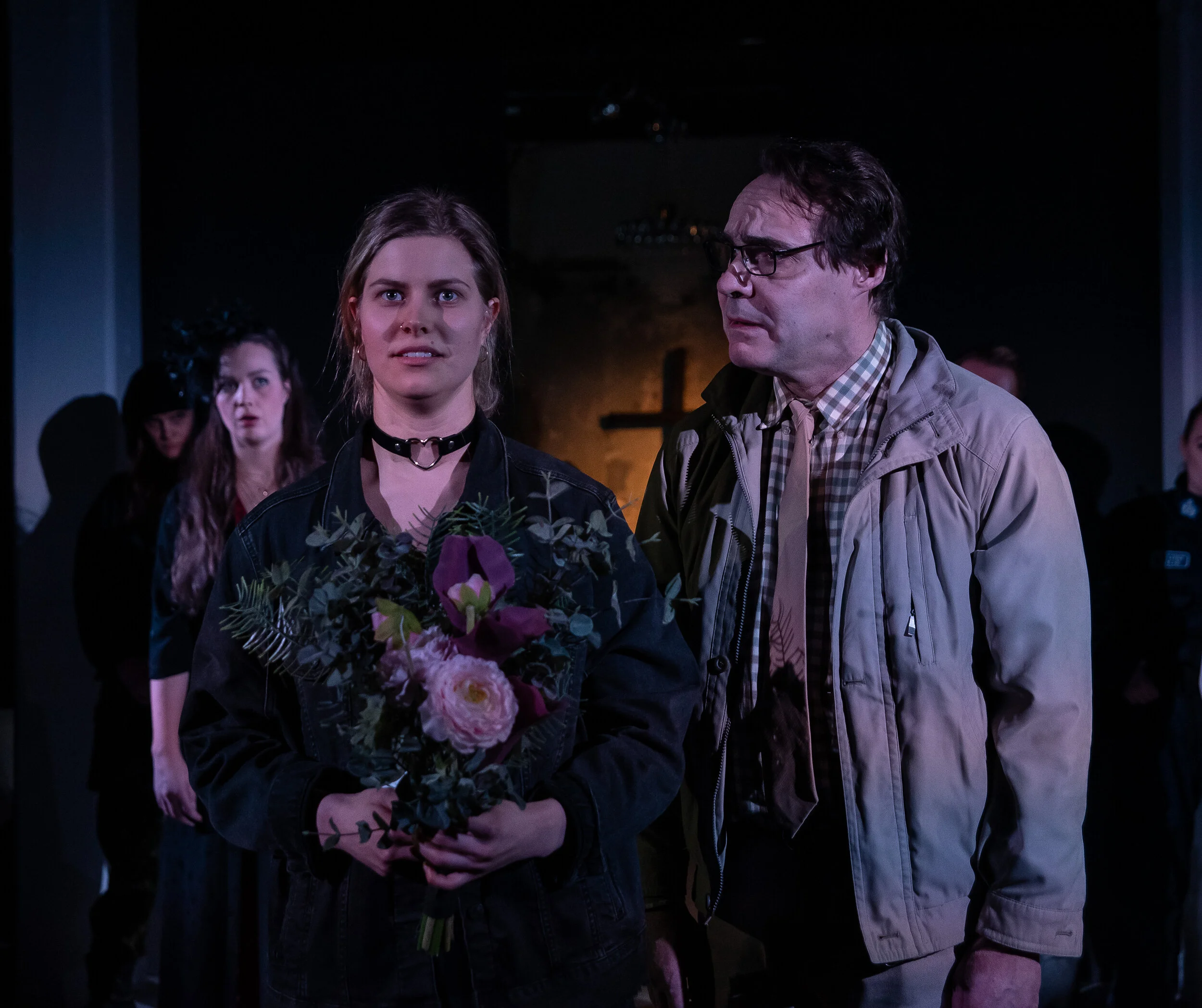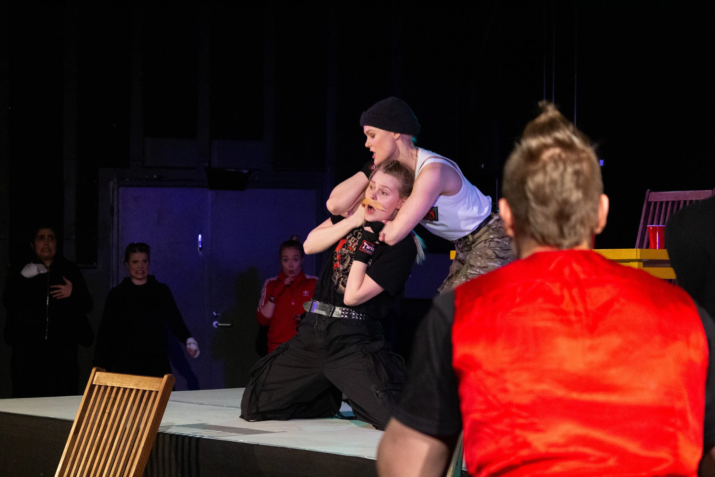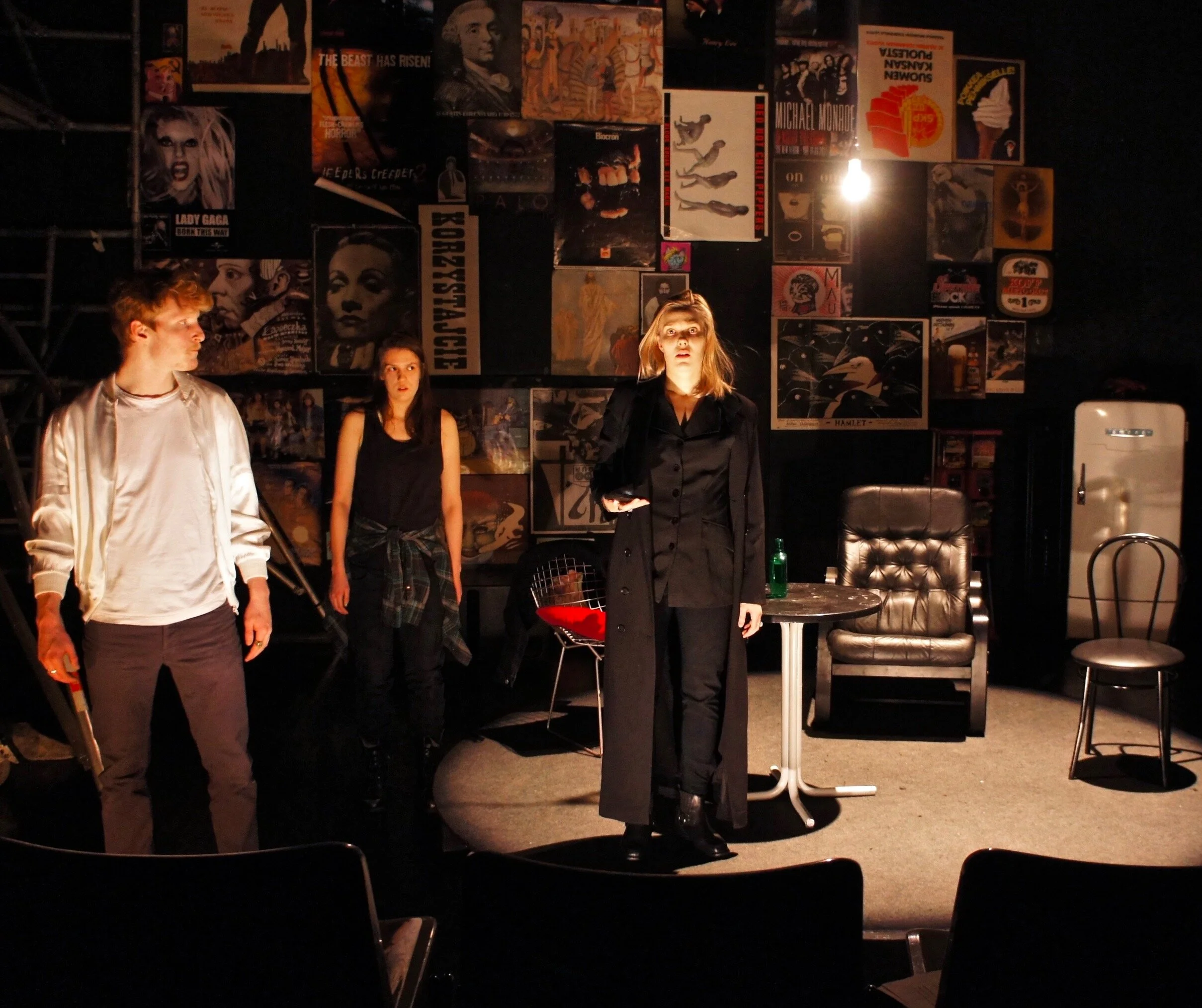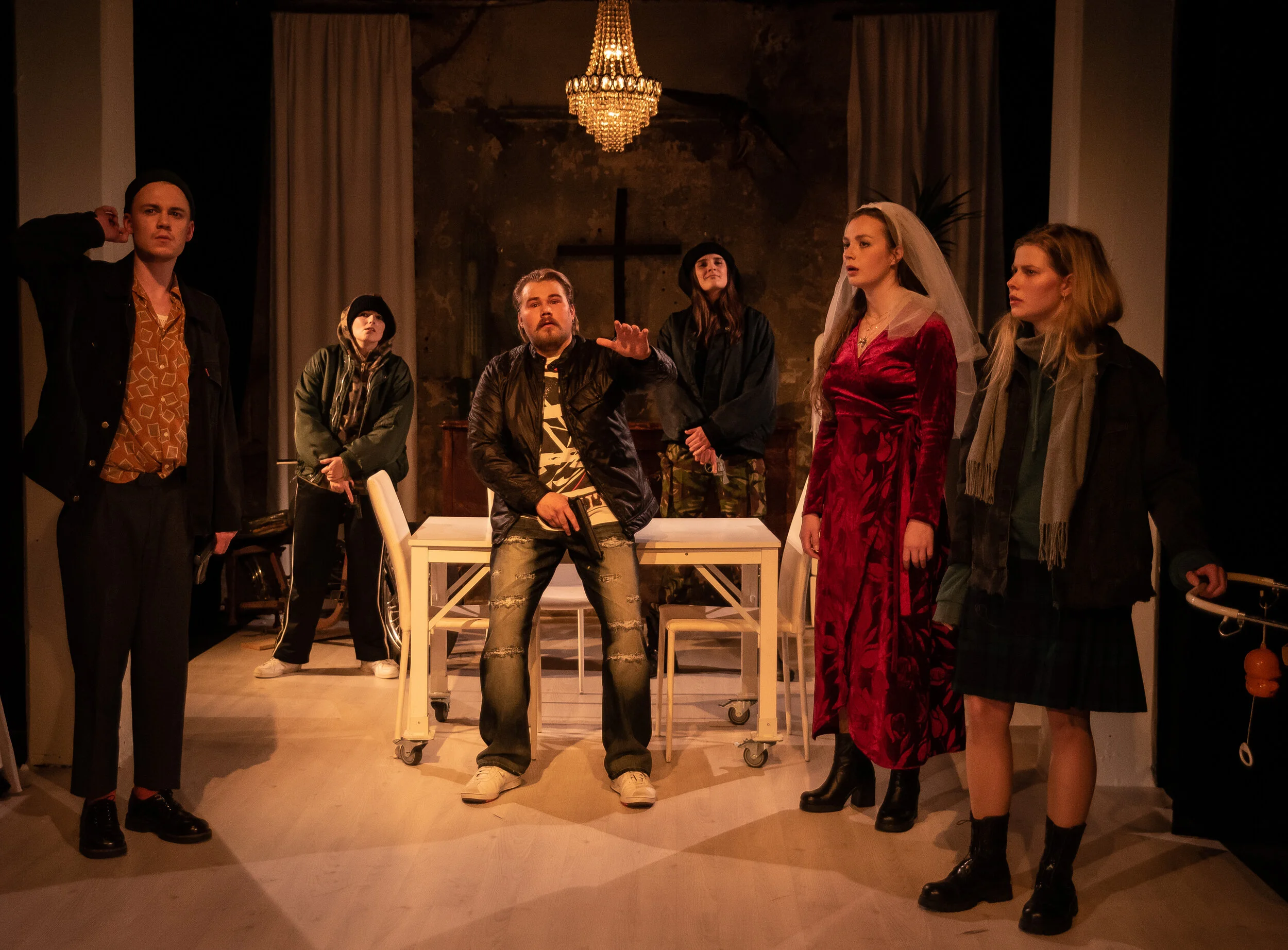 Dead Ständing Hängers is a performance that focuses on the relationship between Hamlet and his mother Gertrude. In this modernization Hamlet’s family has been alienated from society and they run a criminal organization now led by his mother Gertrude. The main themes are social exclusion, parenthood and abandonment. This theatre piece mixes principles of documentary theatre, cartoon style and fantasy elements. The dystopian performance is set in the near-future. The actual scenes of the play draw from true life experiences from individuals that have been “through the system” or brought up in families that are involved in organized crime.